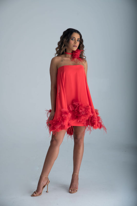 A strapless cocktail dress with a feathery hemline and red ruffled collar, the Acireale Dress...