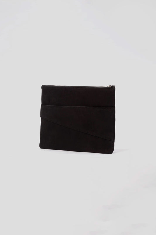 Compact square clutch with a practical handle crafted from luxurious Nubuck material describes the Varedo...