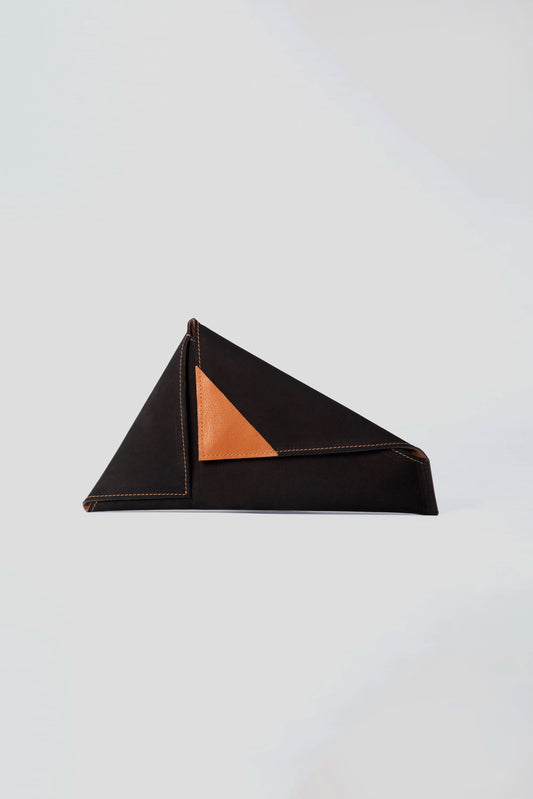 Triangular shape with black and brown scheme and smooth leather-like material define the Pomezia Bag,...