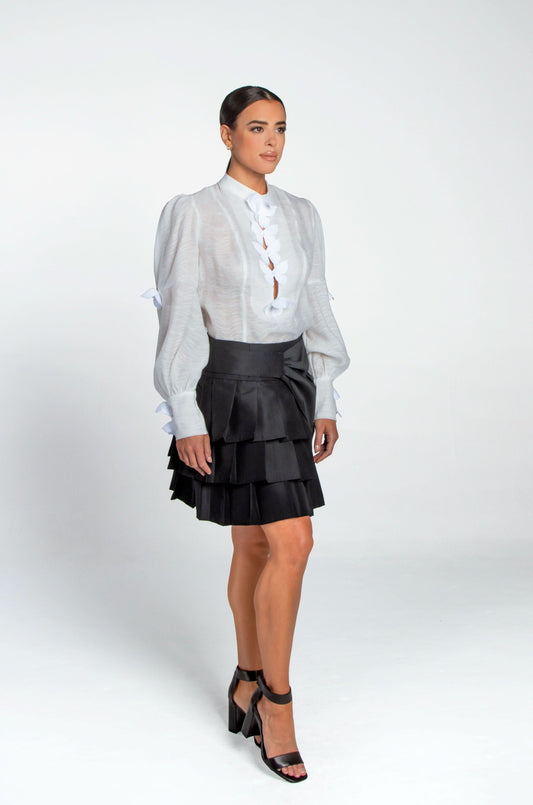 Scafati Skirt with multiple layers of black ruffles creates a voluminous, textured look, adding drama...