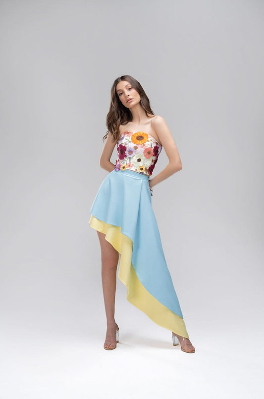 A vibrant high-low hemline defines the Sora Skirt, with a layered, cascading effect creating a...