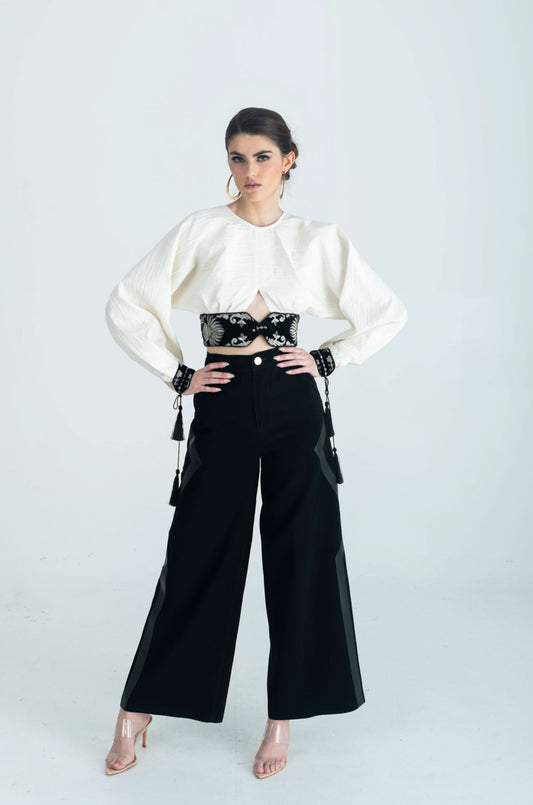 It's a high-waisted, wide-leg style pants. It features a pronounced and unique leather stripe detail...