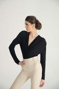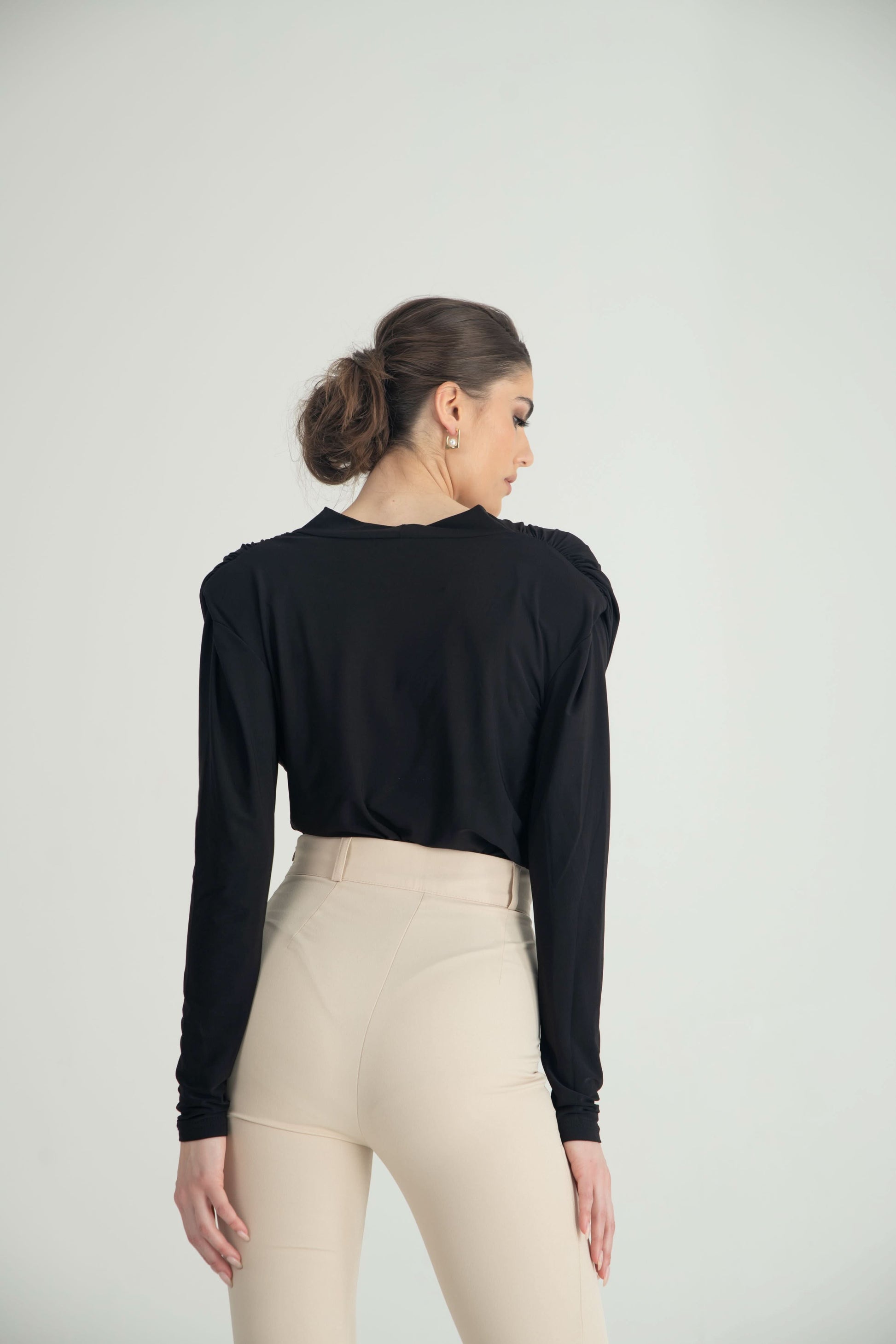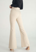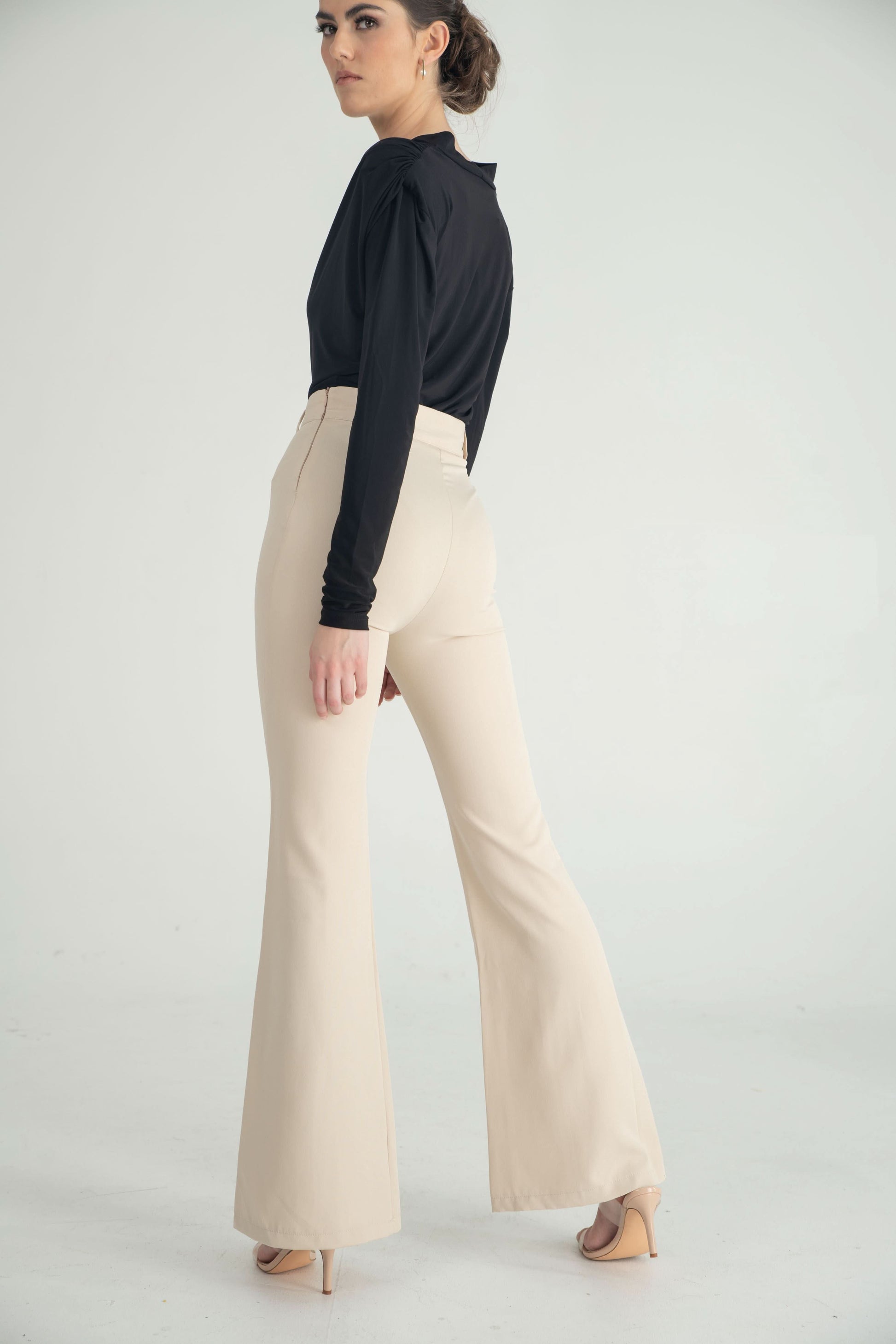 It's a high waisted pants with a flared leg design. They are fitted through the waist and tights, and then flare out from the knee. The design is simplistic, with no additional embellishments, emphasizing a sleek and modern silhouette.