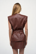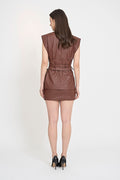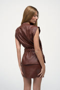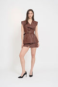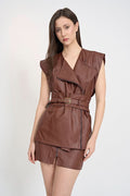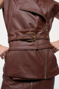 A two-piece faux leather set with a belt and zipper details offers a bold, edgy, and chic aesthetic, combining modern sophistication with a hint of rebellious style. The combination of the belt, zipper accents, and leather gives the set a tough, confident feel while maintaining an air of sophistication. This outfit is perfect for a night out, a fashion-forward event, or a look that blends elegance with a bold edge.