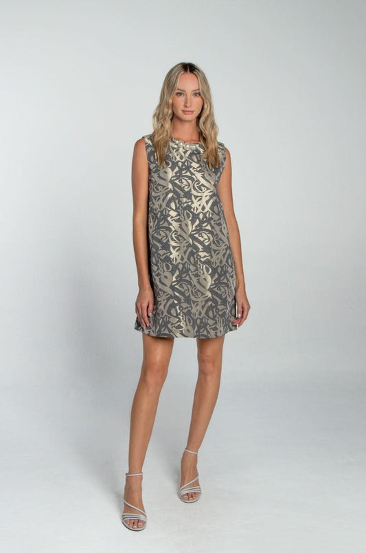 The Mira Dress has a sleeveless design with layered leaves and clusters of white flowers...