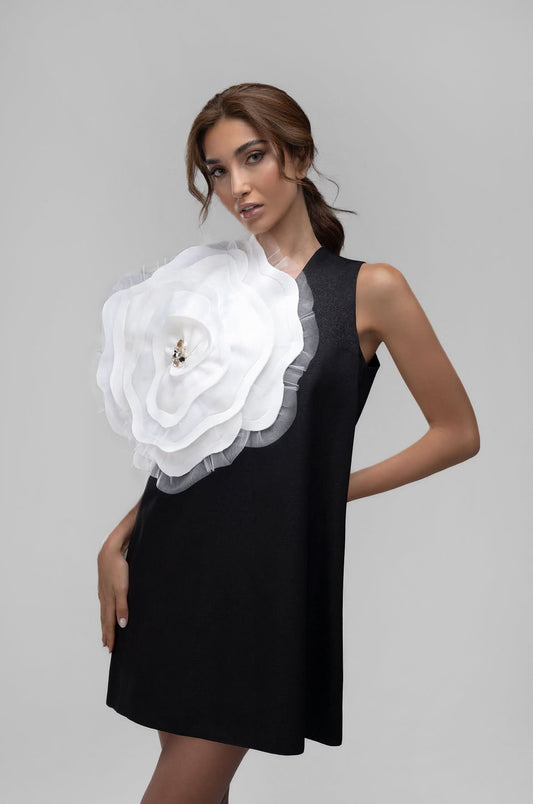 A simple, straight silhouette with a large white fabric flower makes the Conversano Dress perfect...