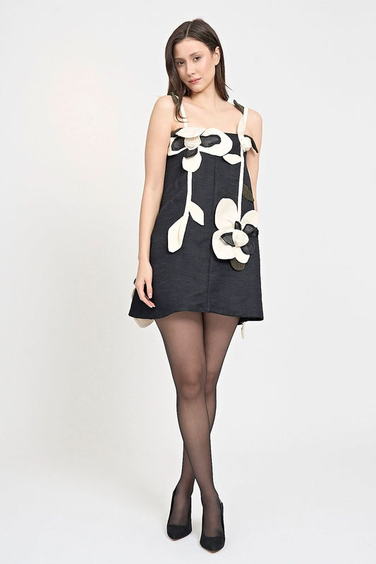 This black mini dress is effortlessly elegant with a touch of nature-inspired beauty. The base...