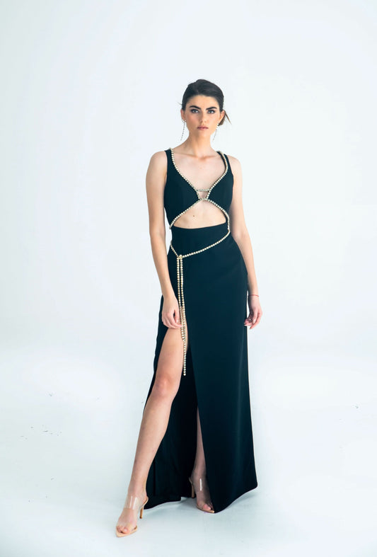 It's a sophisticated evening gown with a high leg slit and series of silver beaded...