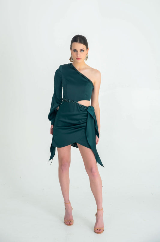Emerald green dress with braided trim outlines the neckline and cut-out waist, while the skirt...