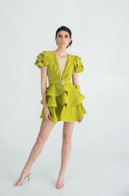 A deep V-neckline and fluttering ruffle sleeves give the Matera Dress its dramatic design, with...