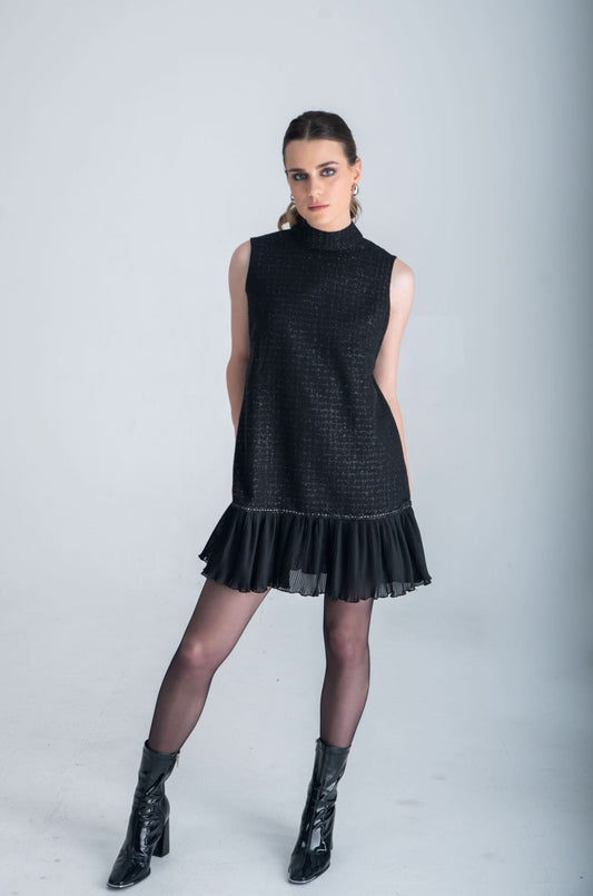 This is a sophisticated tweed dress. It has a straight cut that falls to a...