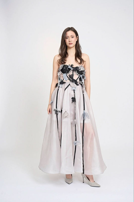 This dress combines a romantic, yet edgy vibe. The top is a bustier-style design, fitted...