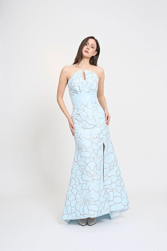 This baby blue strapless dress radiates soft elegance with a touch of boldness. The dress...