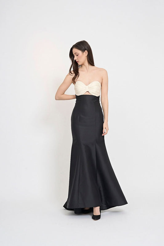 A sleek, elegant dress in black and white, creating a striking contrast. The top of...