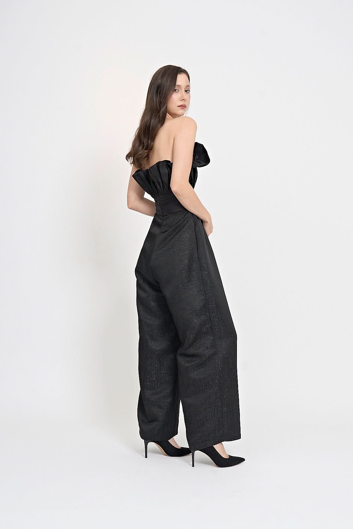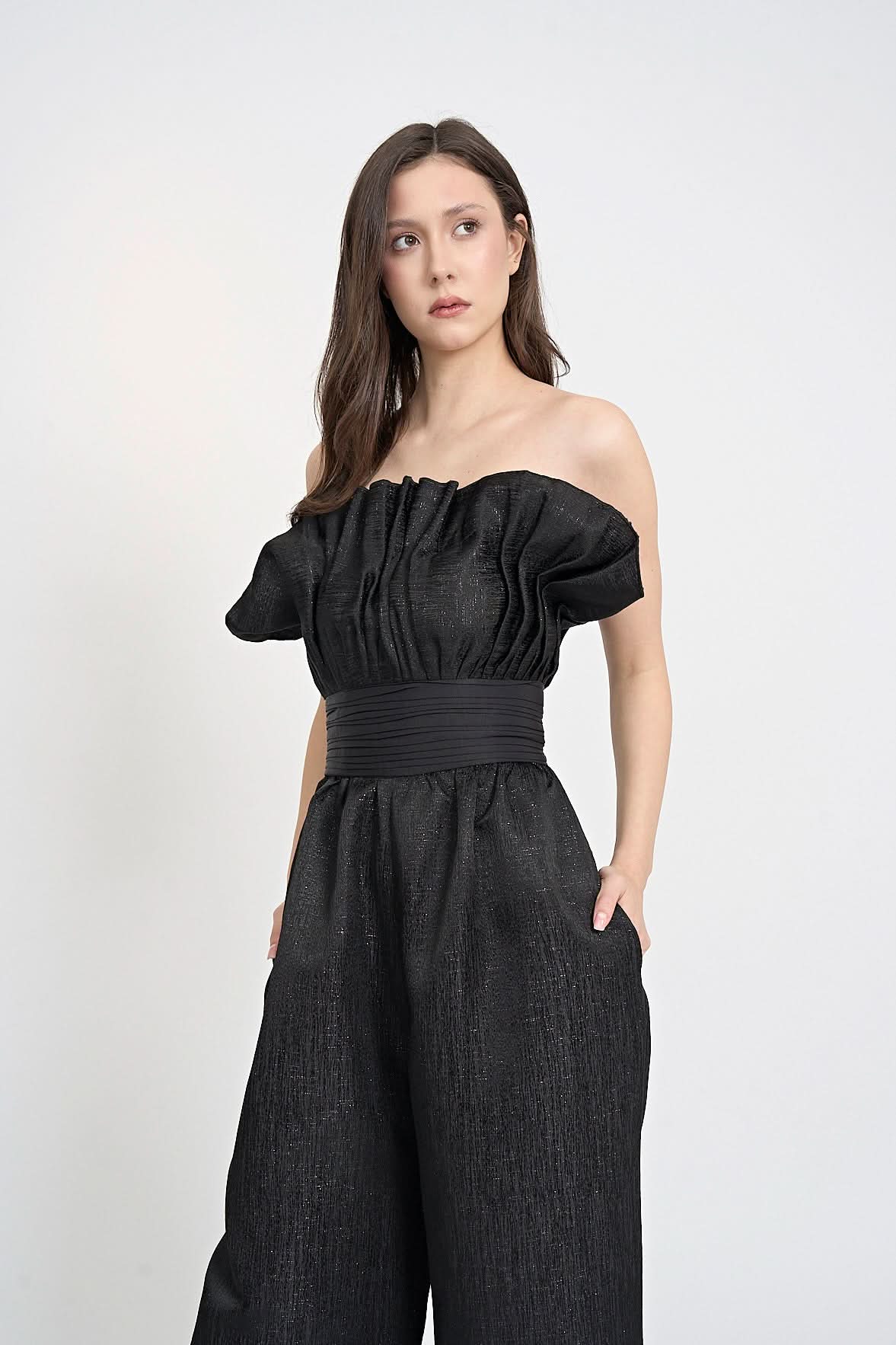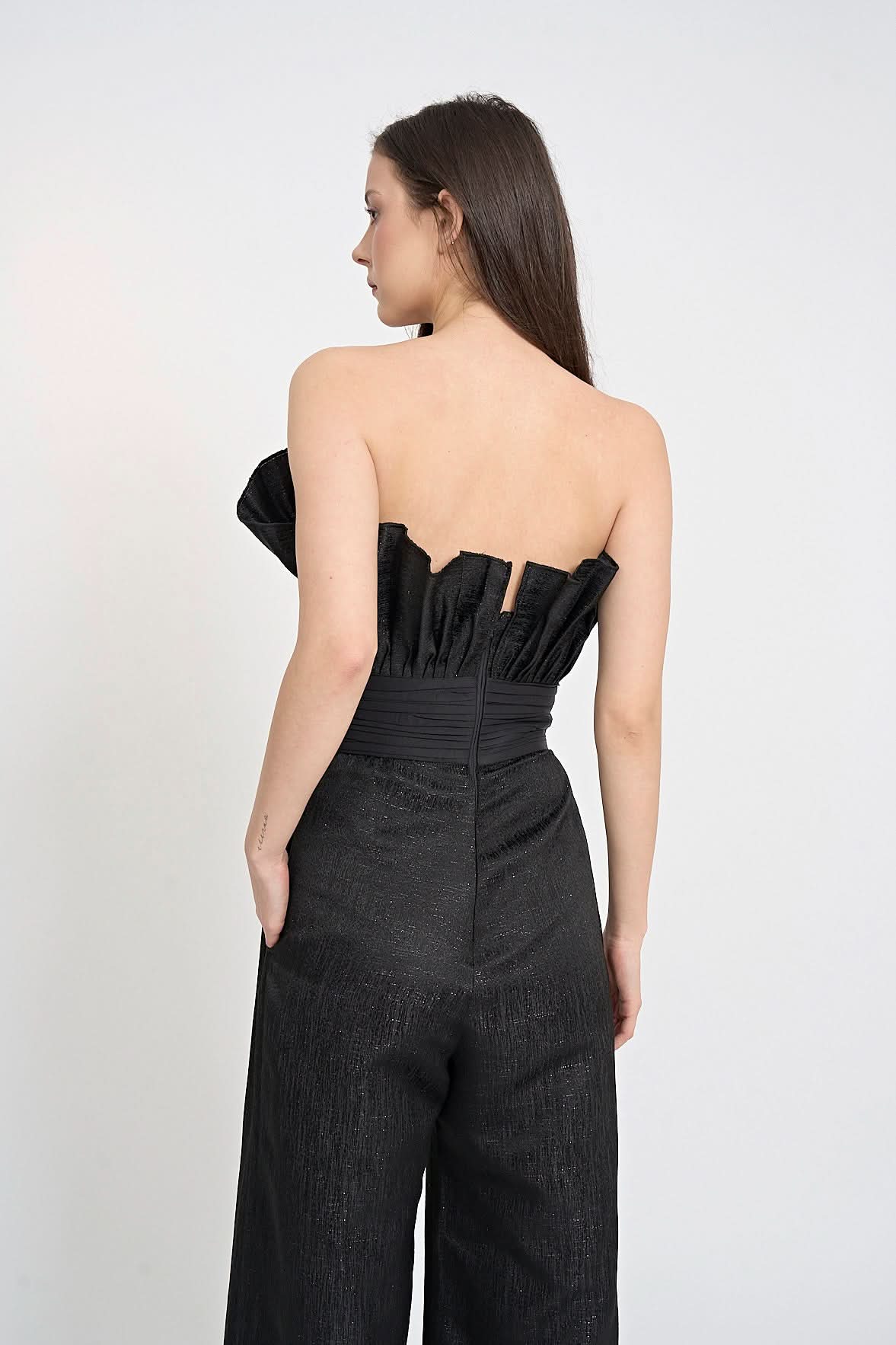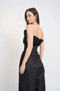 Strapless black jumpsuit with textured sheen offers a fitted bodice and rucked detailing at the waist, creating a sleek silhouette in the Cascina Dress.