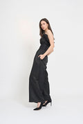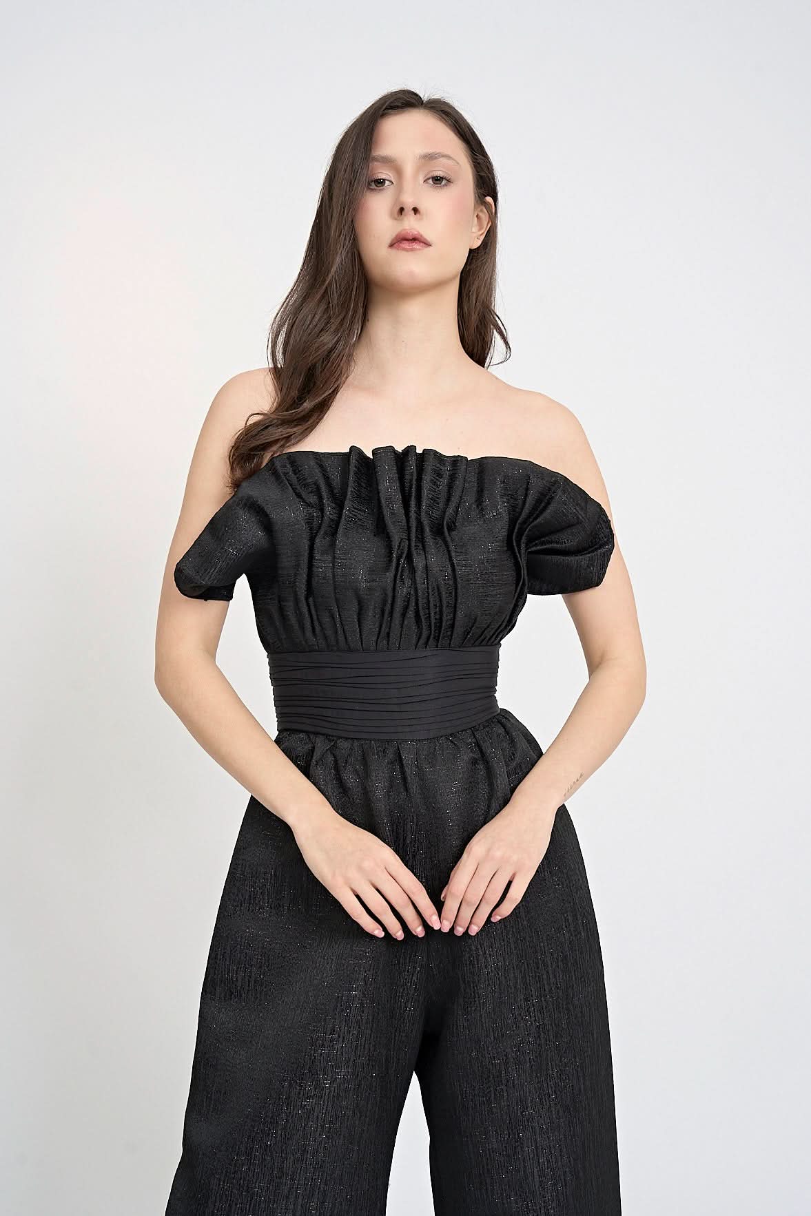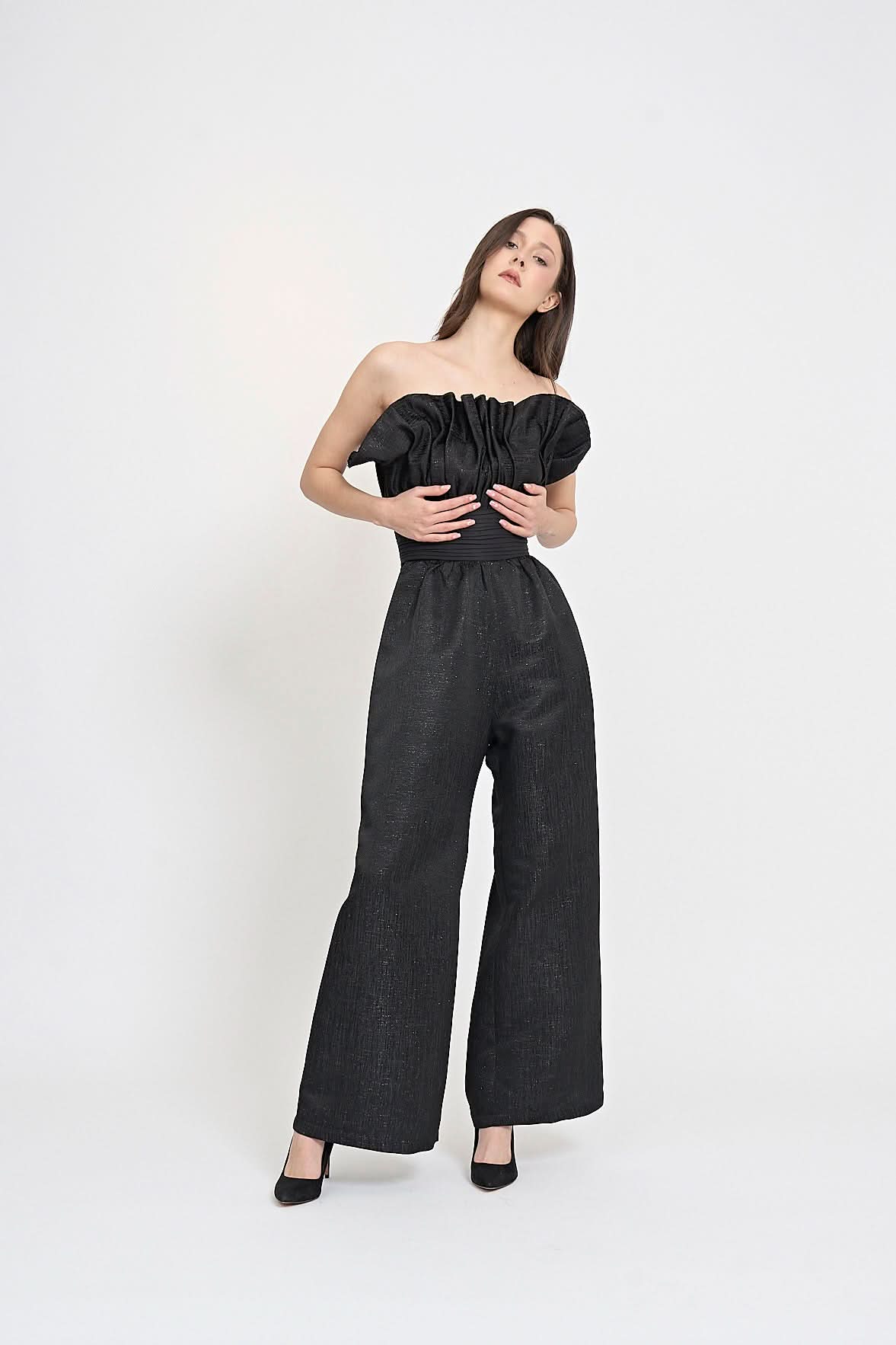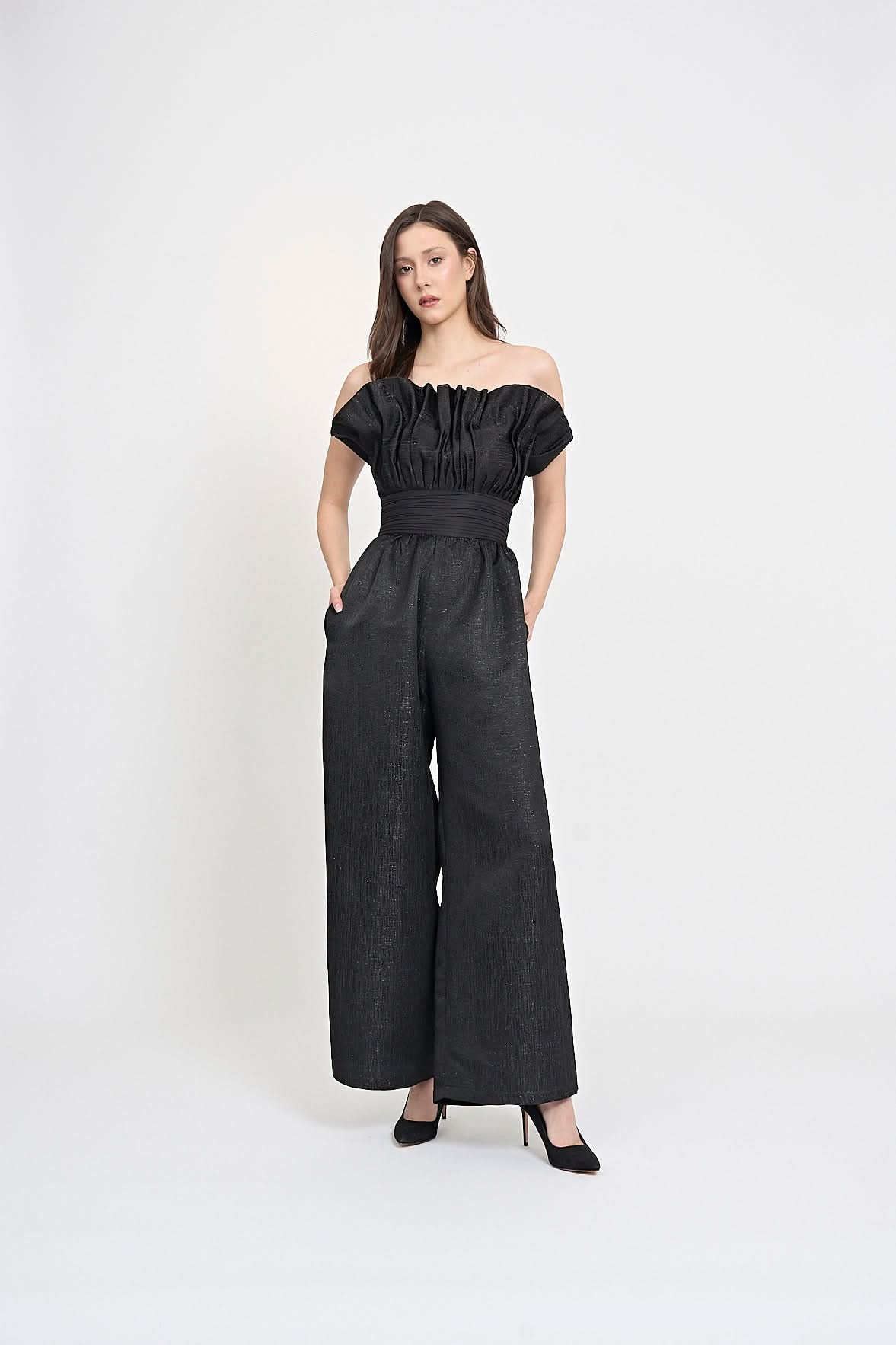 Strapless black jumpsuit with textured sheen offers a fitted bodice and rucked detailing at the waist, creating a sleek silhouette in the Cascina Dress.