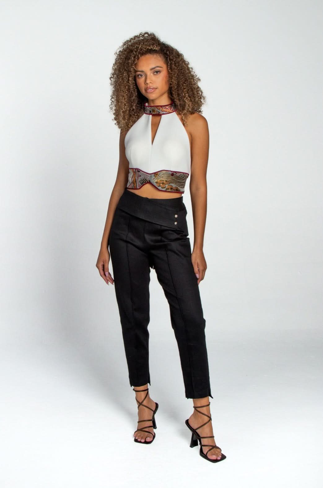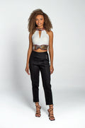 Soyez élégant et stylé dans ce haut court Cormano. Fabriqué avec des ficelles en velours et un paon tressé sur satin, il fera tourner les têtes partout où vous allez. Le dos nu est parfait pour mettre en valeur votre bronzage d'été !
