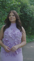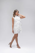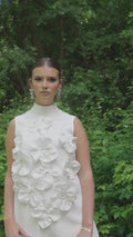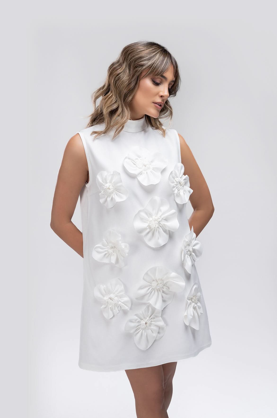 The Correggio Dress features large, three-dimensional floral appliques scattered across the front, adding texture and visual interest.