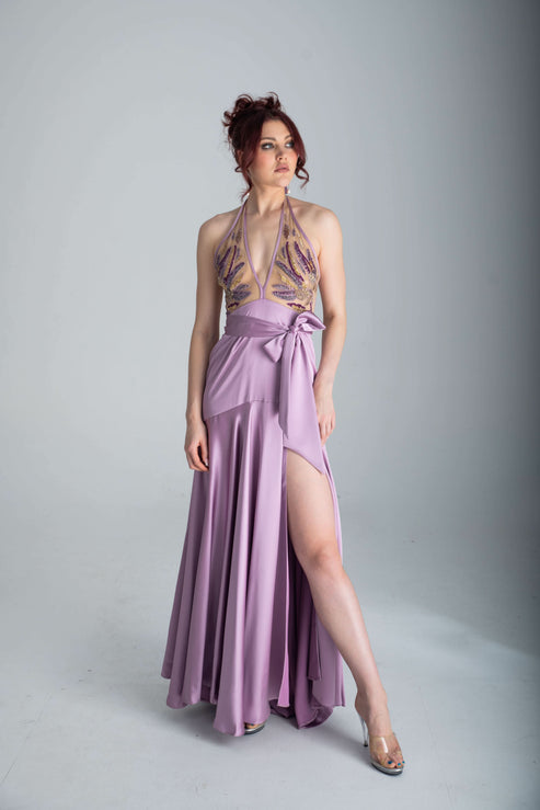 A satin dress in lilac with a halter neck and intricate beadwork, the Scandicci Dress includes a satin belt tied into a large bow.