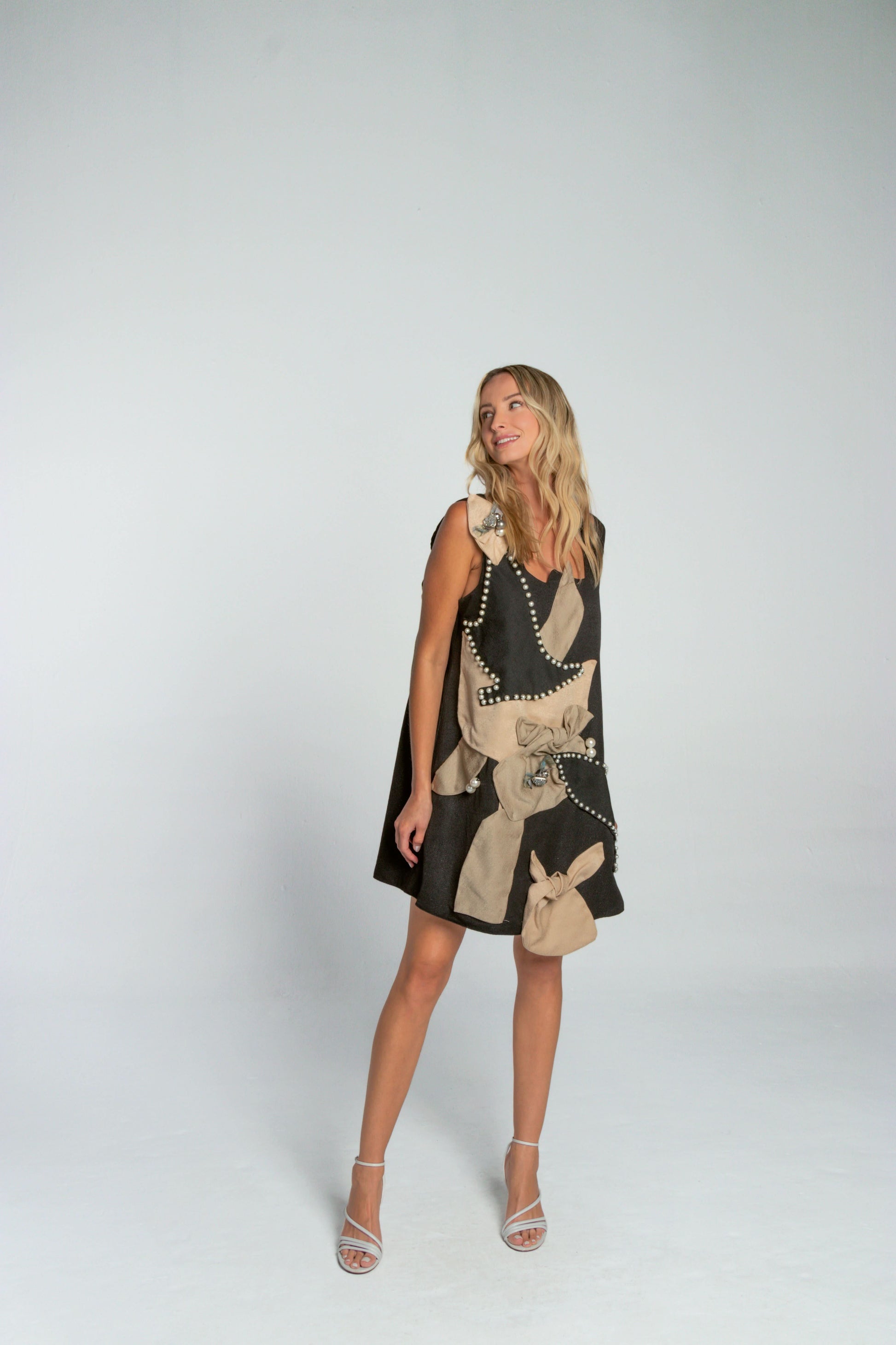 Adorned with beige bows and pearl embellishments, the Taranto Dress offers a playful and dynamic design with cascading details for added flair.