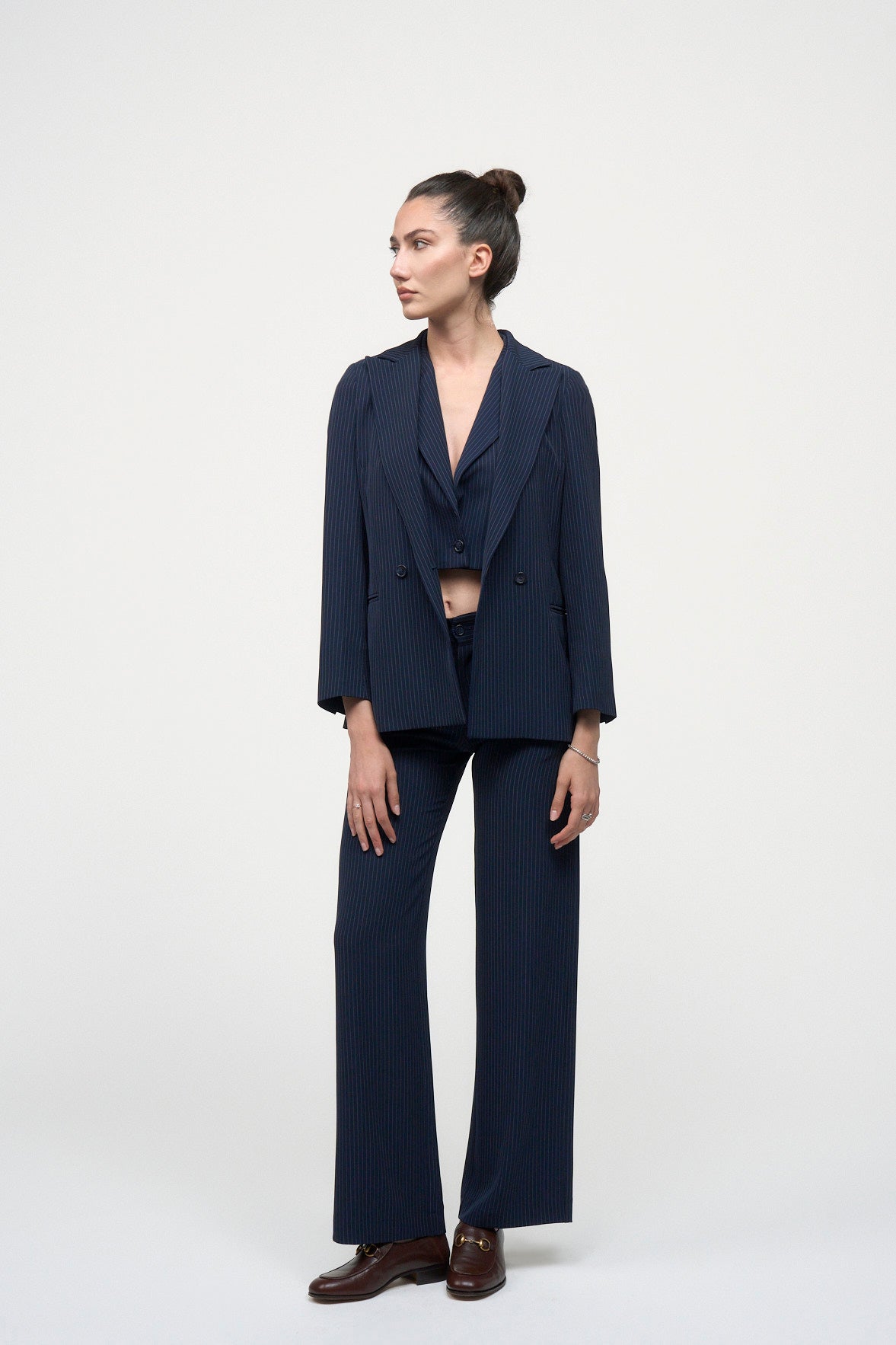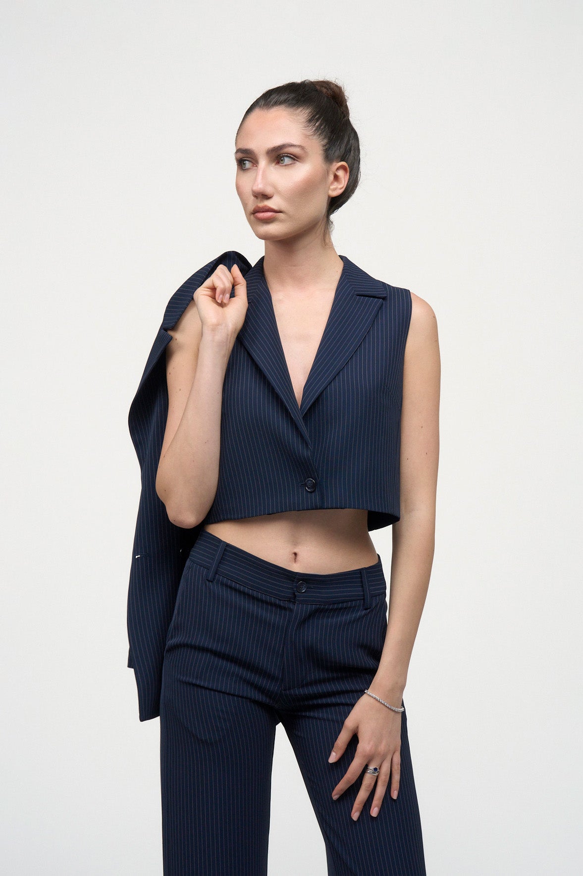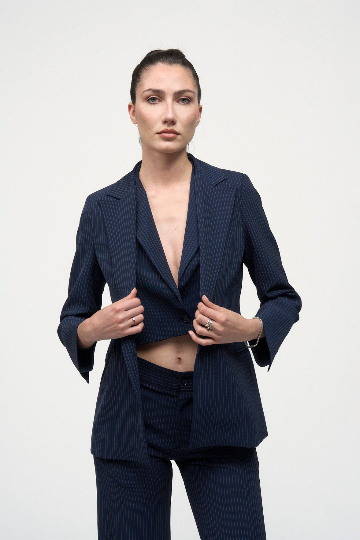 Tailored sophistication redefined — this 3-piece pinstripe set features a cropped double-breasted blazer, structured vest, and wide-leg trousers for a look that’s equal parts bold and timeless. The sharp tailoring and subtle vertical stripes elongate the silhouette, while the cropped cut adds a modern, feminine edge. Perfect for power meetings or elevated evenings, this set embodies effortless confidence and refined minimalism.