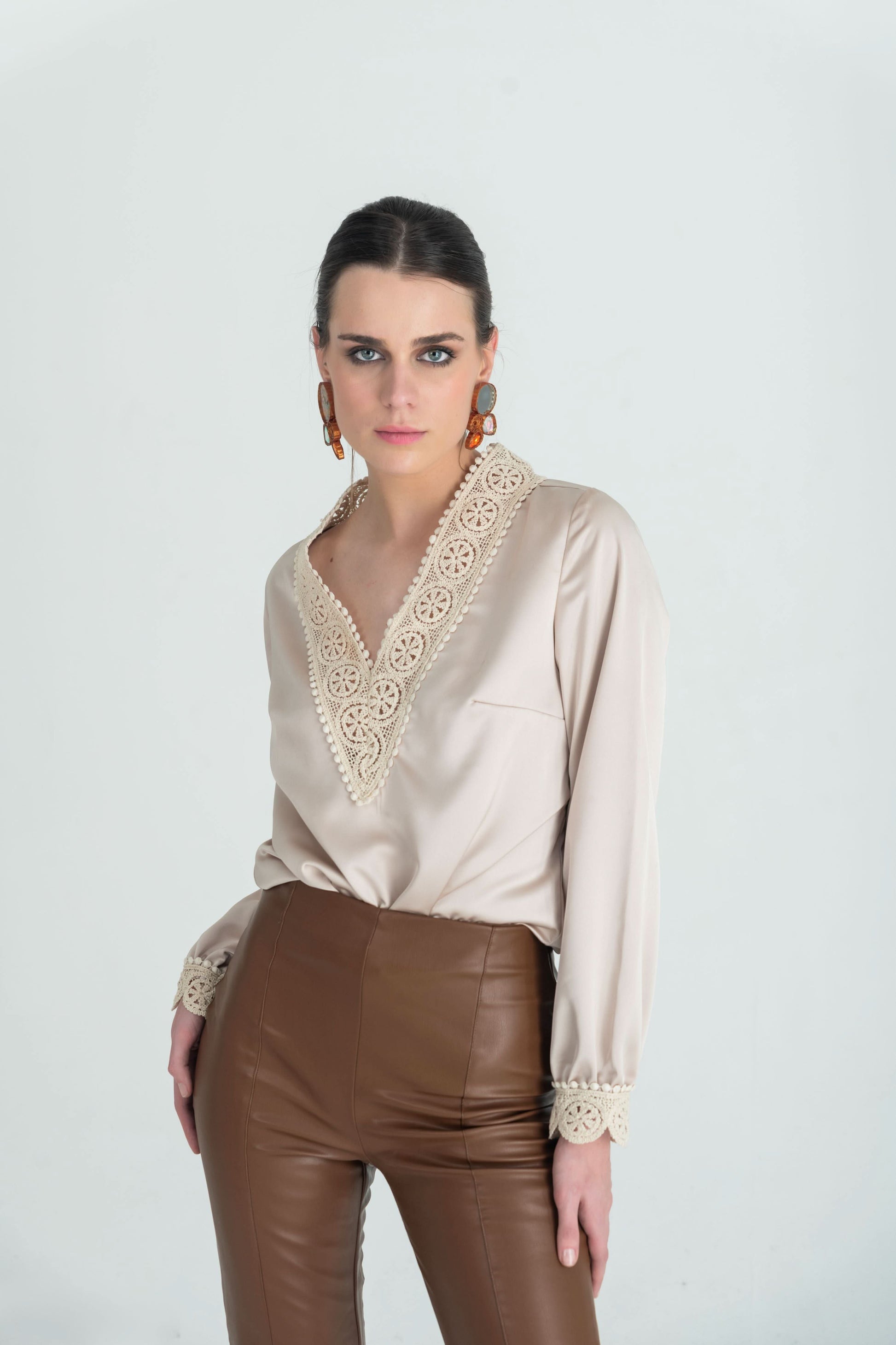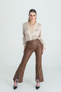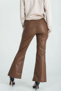 These high-waisted brown faux leather pants feature a sleek, form-fitting silhouette that elongates the legs while providing a chic, modern edge. Designed with a subtle front seam for added structure, they flare slightly at the hem with stylish front slits, allowing for effortless movement and a hint of statement flair. Perfect for pairing with both casual and dressy tops, these pants exude confidence and sophistication.