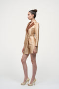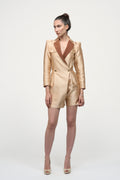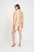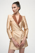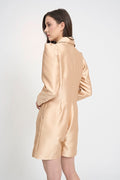 A beige satin jumpsuit with a blazer-structured look exudes sophistication and modern elegance. The jumpsuit is crafted from a smooth, lustrous satin fabric that catches the light and has a soft, luxurious feel. The color is a warm beige, which gives it a timeless, neutral appeal—perfect for both daytime and evening wear.